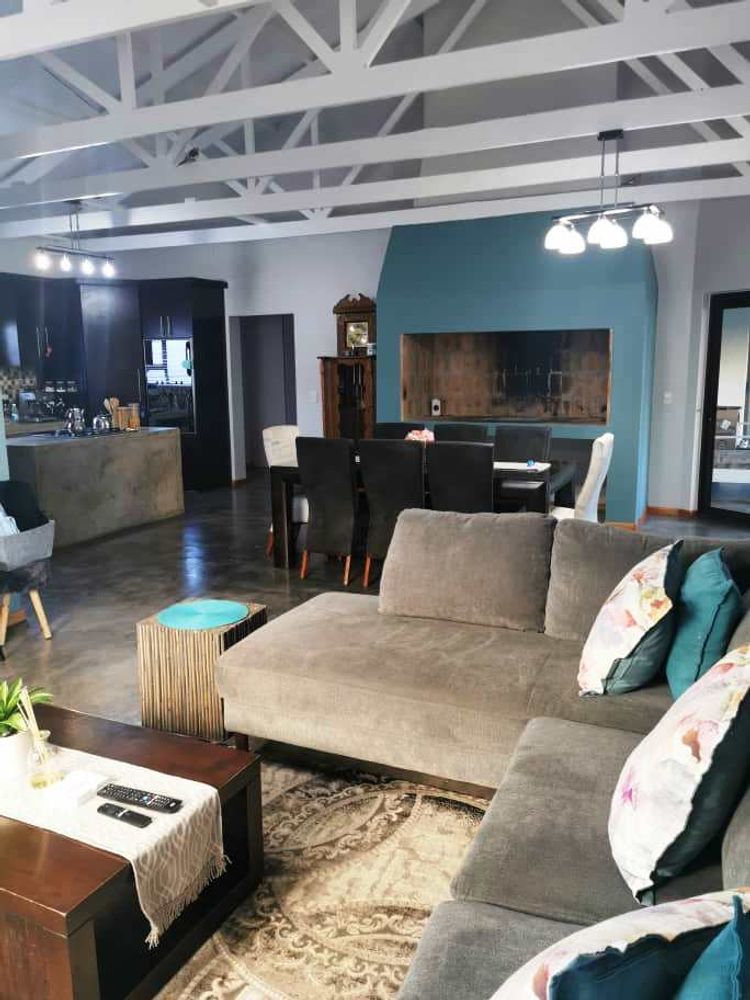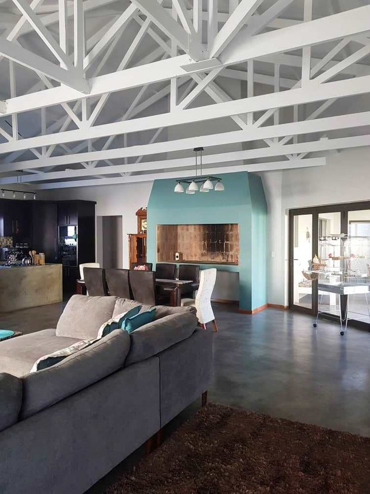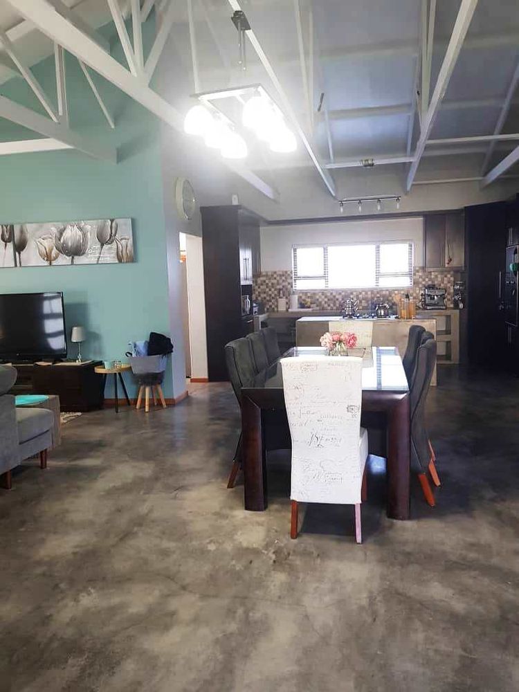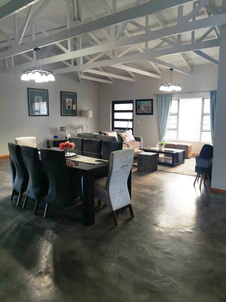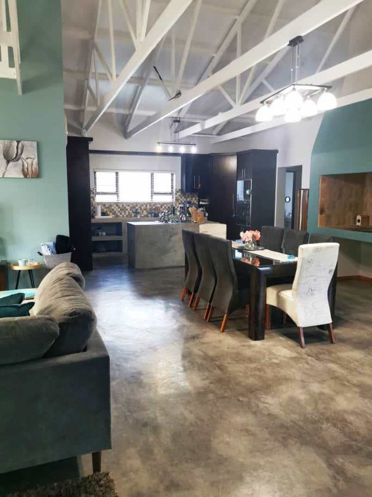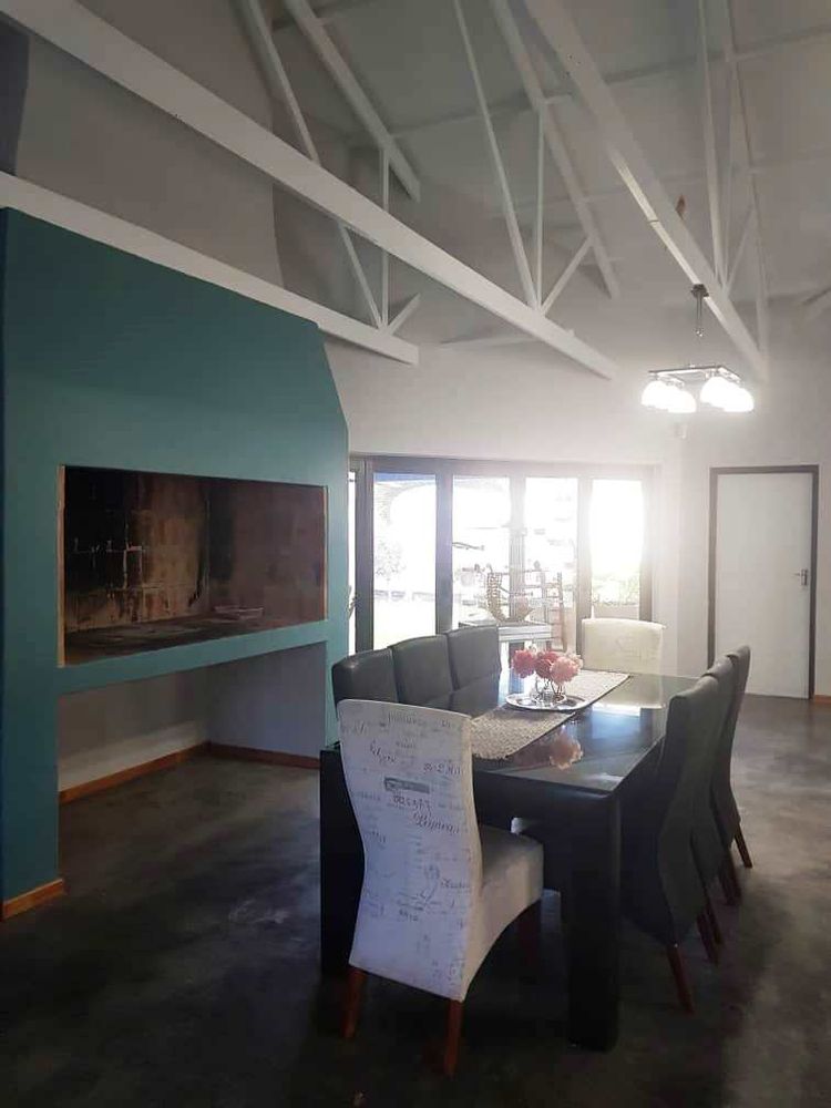 Open plan tv room, dining room with indoor braai - double door opening onto the enclosed stoep with outside braai and garden, kitchen