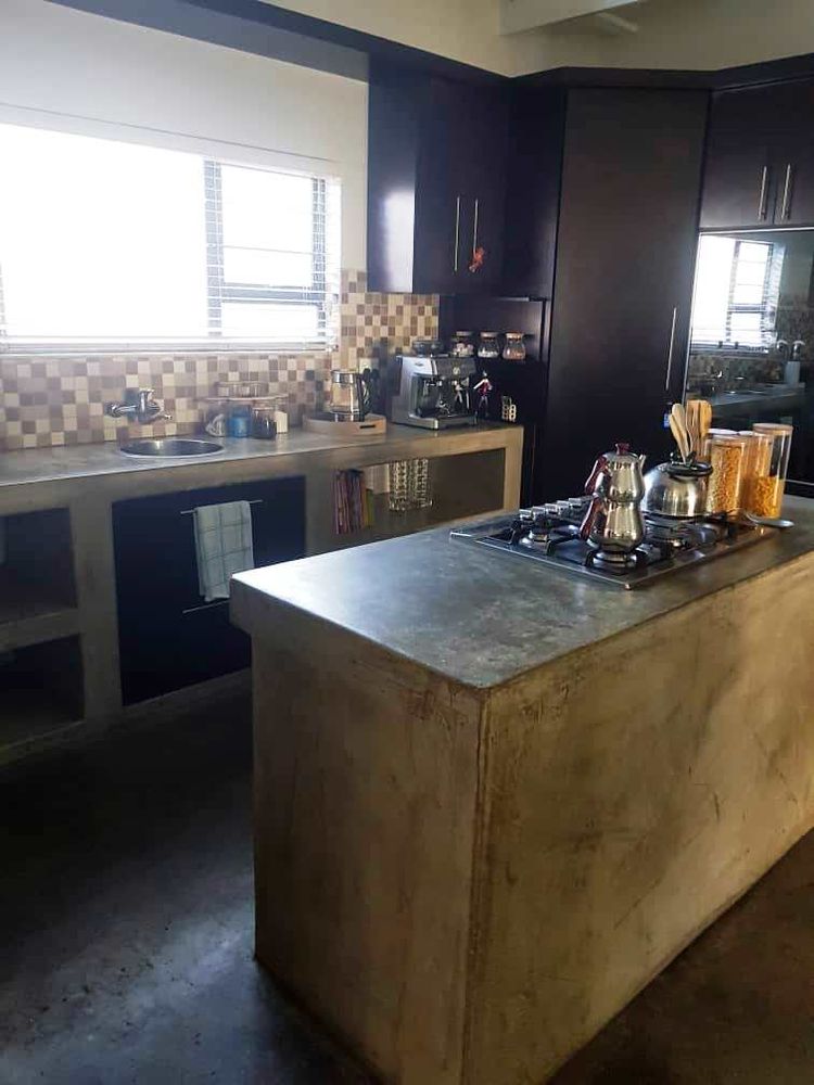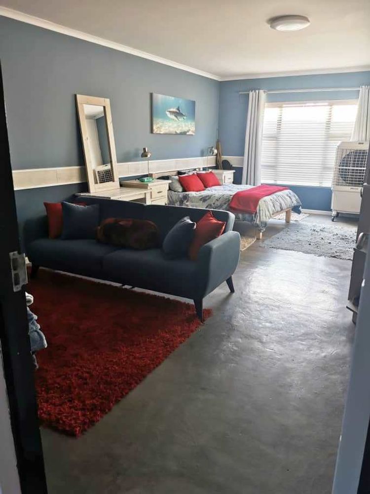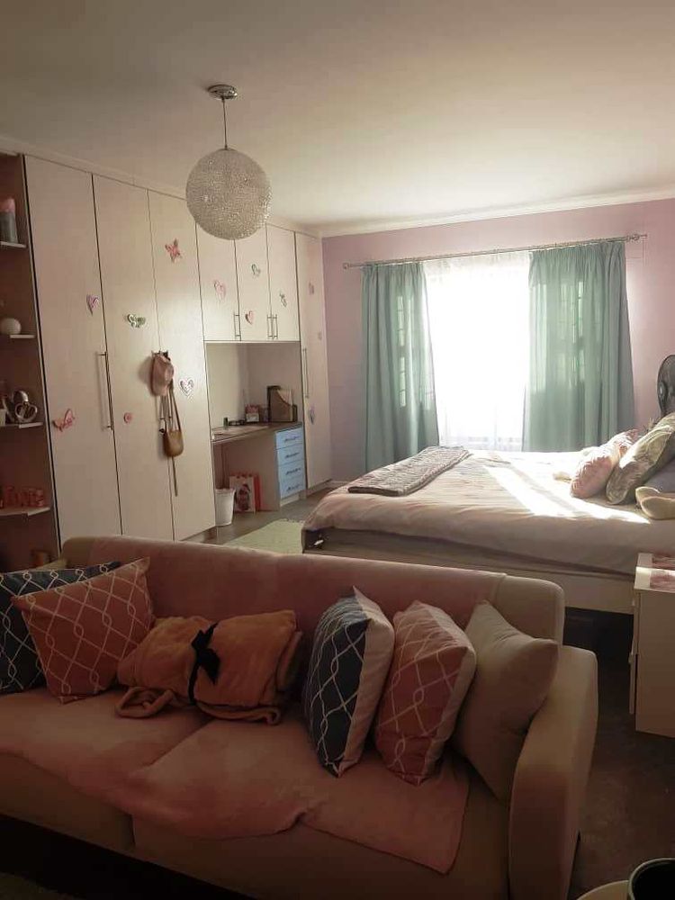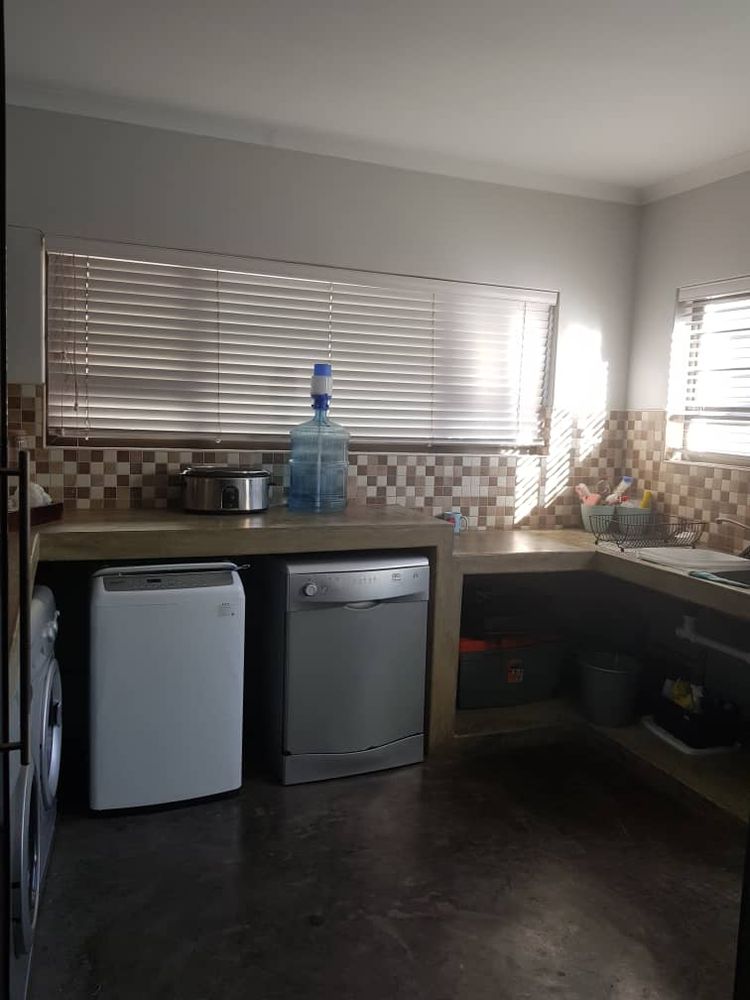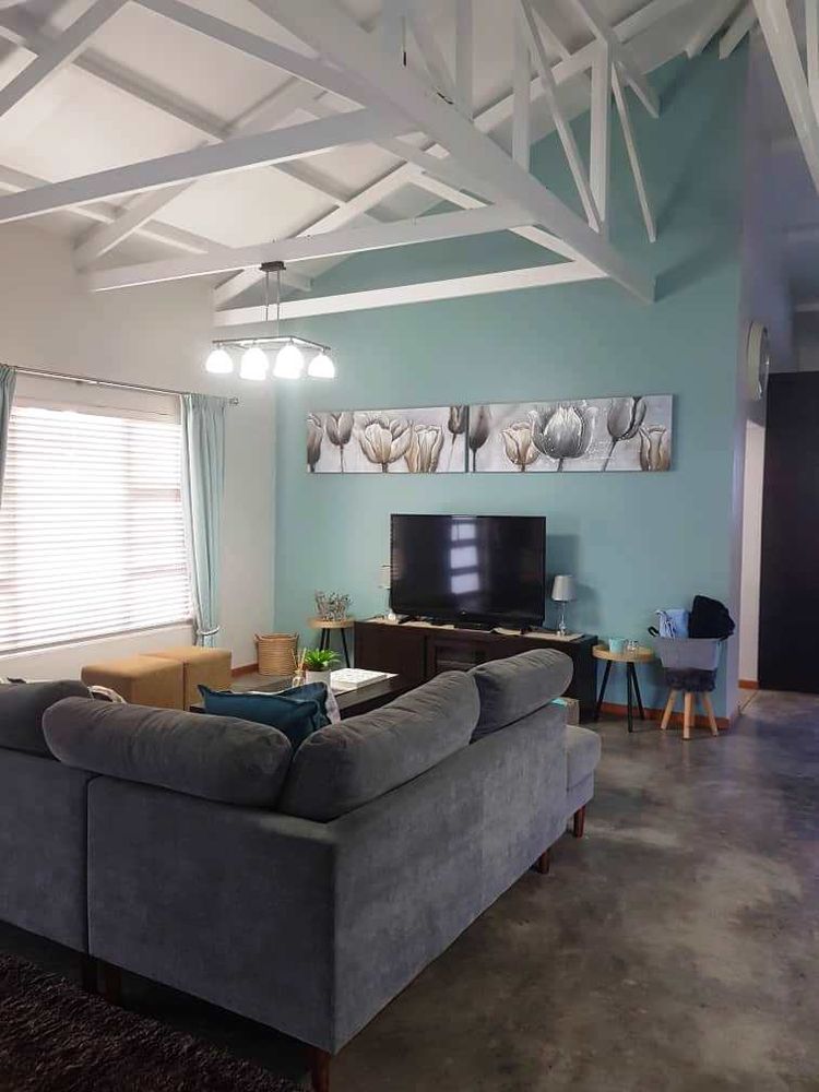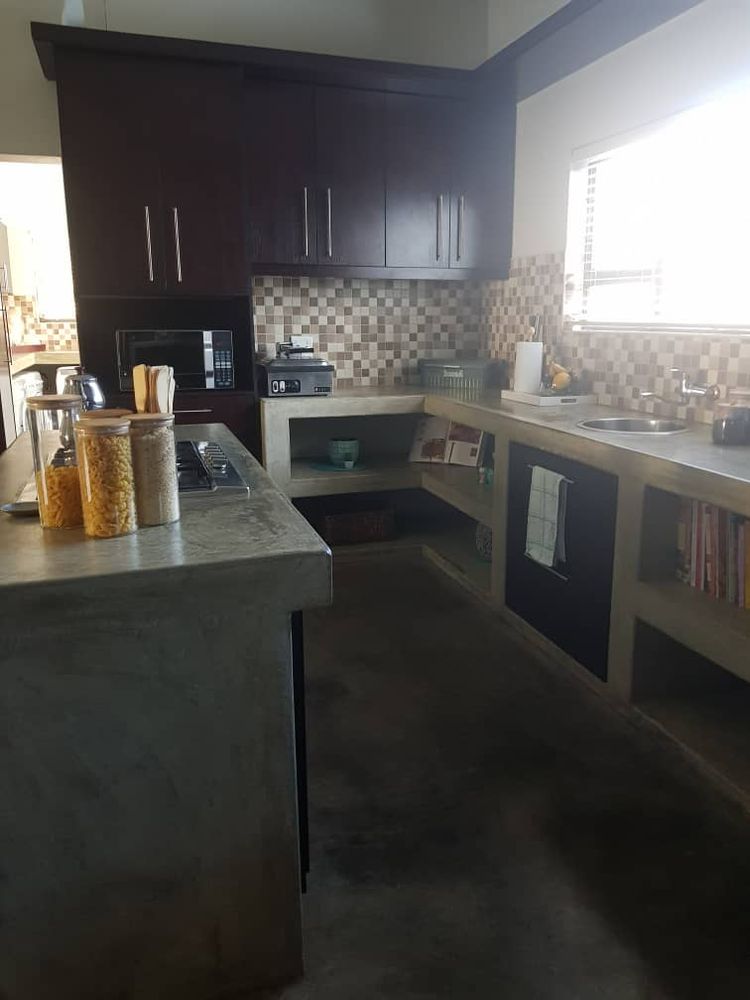 Open plan tv room, dining room with indoor braai - double door opening onto the enclosed stoep with outside braai and garden, kitchen